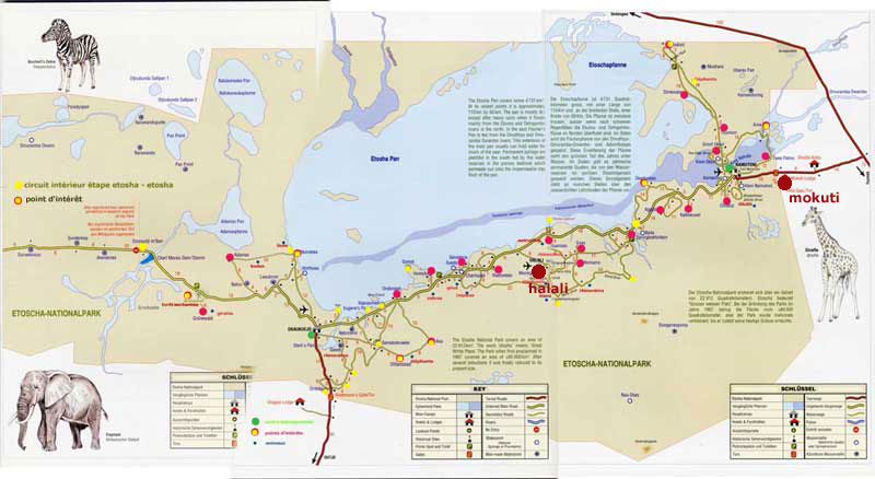 le pan, l'ancien lac asséché, couvre 1/4 de la superficie actuelle du parc et naquit il y a environ 12 millions d'années sous la forme d'un lac peu profond alimenté par le cunène. Les bouleversements climatiques et tectoniques réduisirent le niveau de l'eau et créèrent ce pan saumâtre qui ne se remplit que les années de pluies abondantes. La dépression actuelle est alimentée par des cours d'eau appelés oshanas (lits de rivières asséchées) ou omiramba (vallées pluviales fossiles qui peuvent être souterraines. Ainsi au nord, vous trouverez les oshannas Ekuma et Oshigambo, et à l'est les omuramba Ovambo et Omuthiya. Les premiers Européens arrivèrent en 1851 dans cette région, mais c'est seulement en 1907 que fut crée la réserve animale. Celle ci s'étendait alors sur 93.250 km2 (1/6 de la France !). Limité actuellement à 22.275 km2, il reste l'une des plus grandes réserves animalières du monde, s'étirant sur plus de 350 km, d'est en ouest.